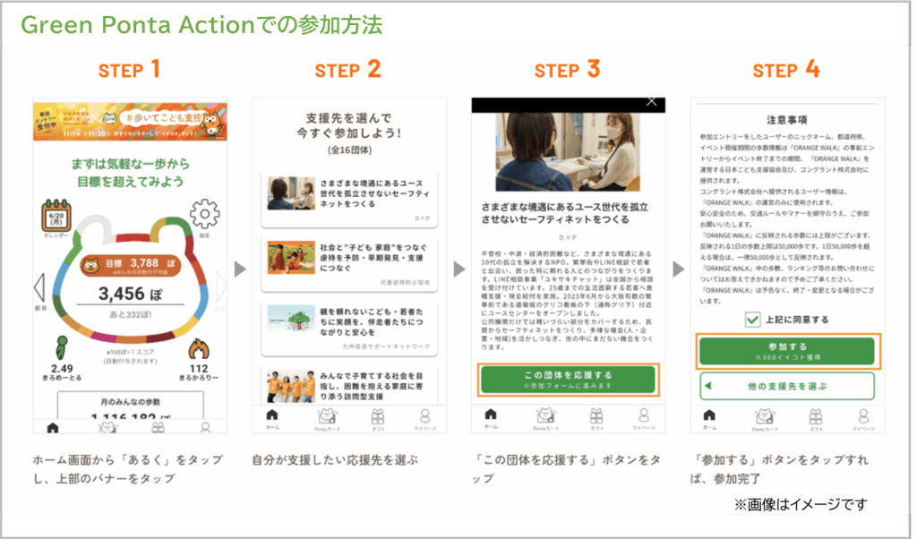 LMが運営するアプリ「Green Ponta Action」もしくは、コングラント株式会社のアプリ「minpo」から参加することができます。アプリ「Green Ponta Action」では、ホーム画面の「あるく」から、特設サイトにアクセスして応援したい団体を選び、参加フォームに入力するとエントリー完了となります。参加いただいた方にはもれなく300イイコト(アプリ内のスコア)をプレゼントします。全国どこからでも、オンラインチャリティウォークに参加いただけます。
