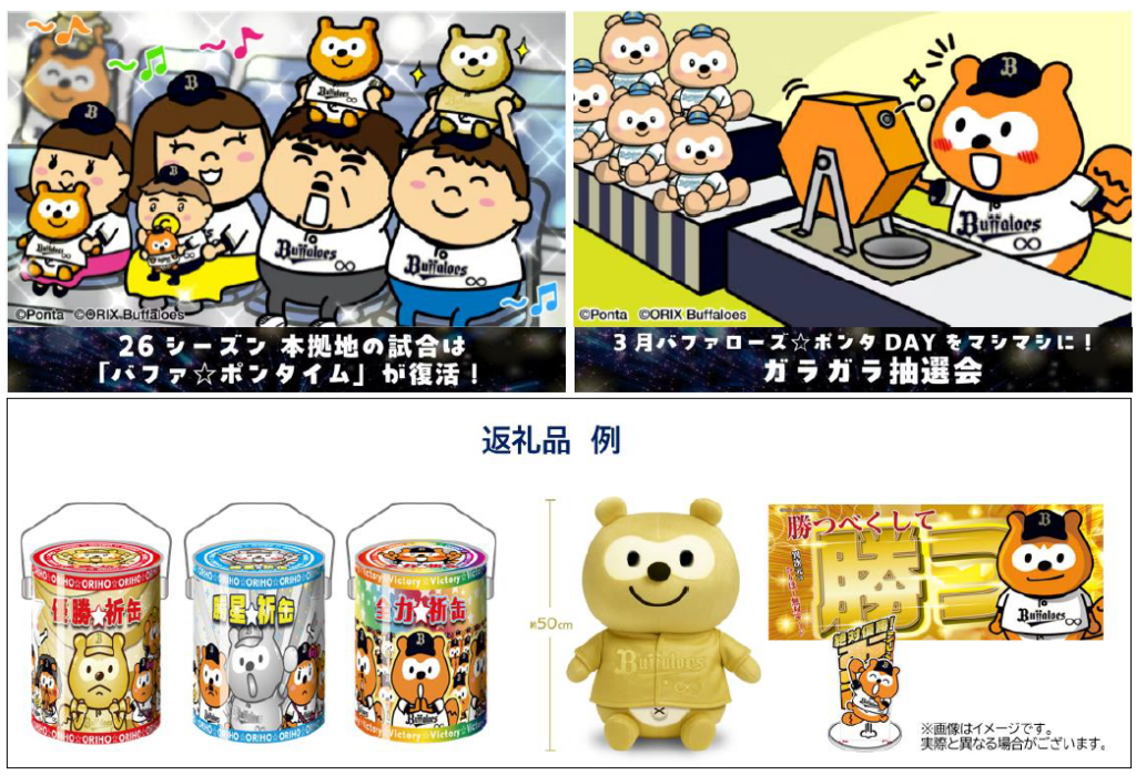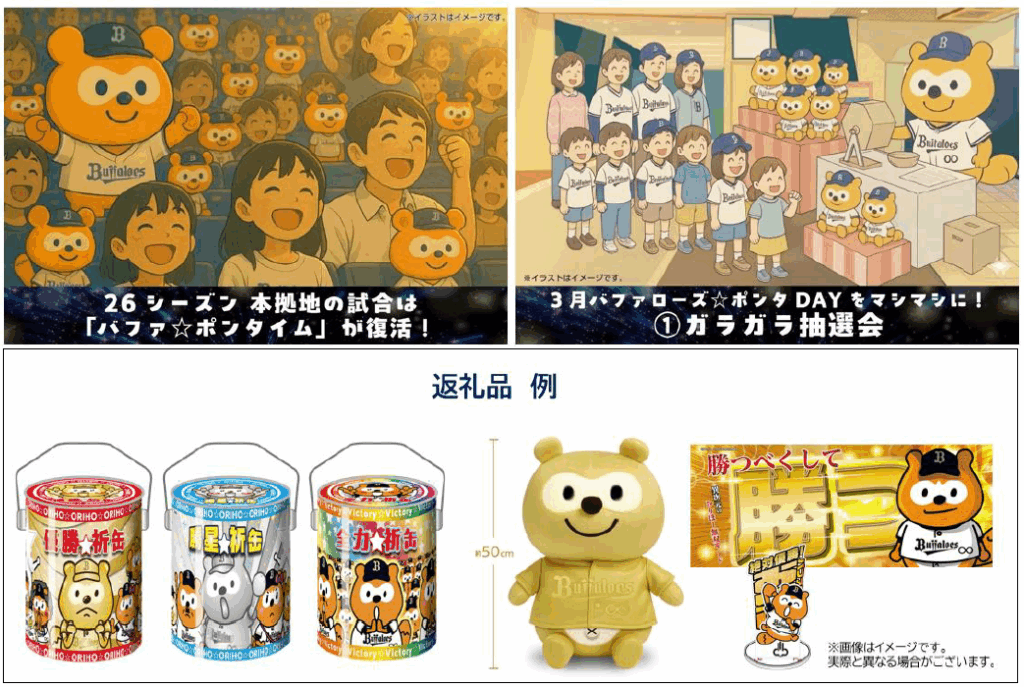 | 目標金額・用途 | 第1目標 500万円 2026年3月のバファローズ☆ポンタDAYでの「ガラポン抽選会の実施」、「シールプリント機の設置」に活用 最終目標 1,100万円 2026年シーズンに京セラドーム大阪で開催する全試合で「バファ☆ポンタイム」の実施に活用 |