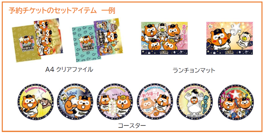 予約チケットには、A4クリアファイル(全2種)、コースター(全10種)、ランチョンマット(全6種)がランダムで1つずつ付きます。