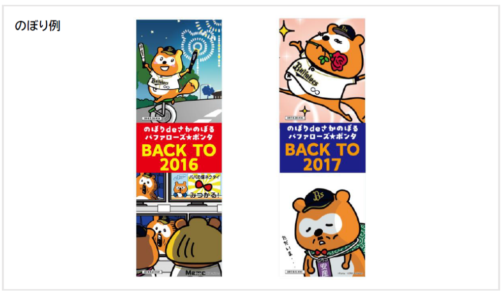 公式Xで話題となったイラストの「のぼり」を会場内に設置して、ファンの皆様と思い出をさかのぼります。第1戦では2016~2020年シーズンのイラストの「のぼり」10種類を設置します。バファローズ☆ポンタDAY 2025で設置した「のぼり」と異なるデザインで制作します。