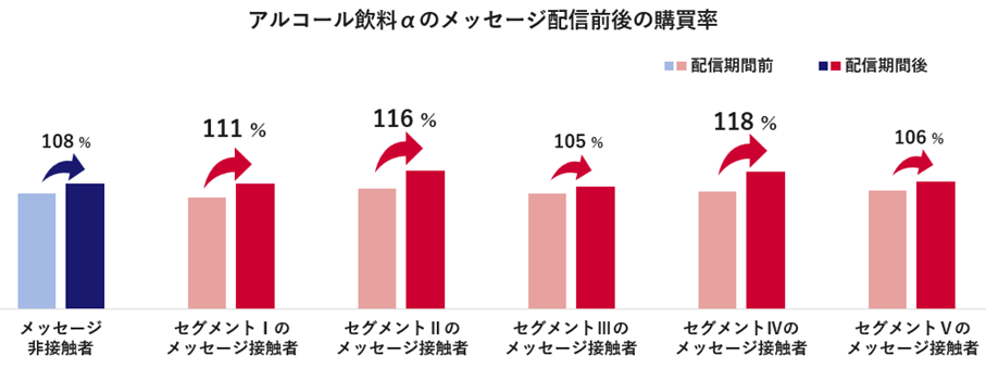 本プロモーションにおける各セグメントのメッセージ接触者(開封した人)と非接触者について、メッセージ配信期間の前後2週間ずつのアルコール飲料αの実店舗での購買率を可視化しました。メッセージ配信後のアルコール飲料αの購買率は、メッセージ非接触者において108%に上昇しています。これと比較して、セグメントⅠは111%、Ⅱは116%、Ⅳは118%となり、さらに高い購買率の上昇が見られました。一方で、セグメントⅢとⅤでは上昇幅が比較的小さく、購買行動への影響が限定的だったと考えられます。