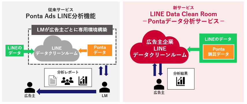このたび、こうしたニーズにお応えし、「LINE Data Clean Room -Pontaデータ分析サービス-」をLINEヤフー社と共同開発し、販売を開始しました。本サービスでは、LMが保有するPontaの購買データのうち対象商品の購買データを、個人を特定しない形でセキュアにLINEヤフー社のLDCR上で広告主企業のLINE公式アカウントやLINE広告に関するデータに連携します。同社を介して、広告主企業のLDCRにPontaデータを連携することで、広告主企業自らLINEを活用したプロモーションの購買効果を分析する仕組みを実現しています。